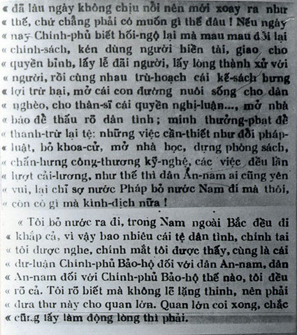 Thư của Phan Châu Trinh (đoạn trích) gửi Toàn quyền Đông Dương in trong sách Phan Tây Hồ di thảo xuất bản tại Hà Nội, năm 1927.